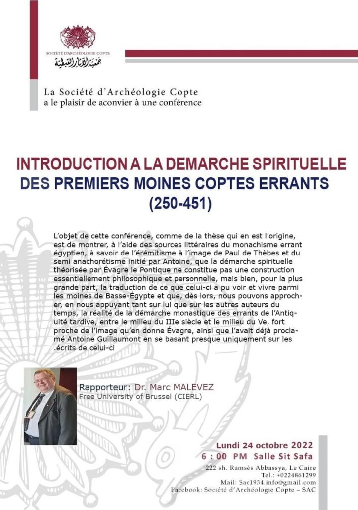 L‘objet de cette conférence, comme de la thèse qui en est l’origine, est de montrer, a l’aide des sources littéraires du monachisme errant égyptien, a savoir de l|’érémitisme à l’image de Paul de Thèbes et du semi anachorétisme initié par Antoine, que la démarche spirituelle théorisée par Évagre le Pontique ne constitue pas une construction essentiellement philosophique et personnelle, mais bien, pour la plus grande part, la traduction de ce que celui-ci a pu voir et vivre parmi les moines de Basse-Égypte et que, dés lors, nous pouvons approcher, en nous appuyant tant sur lui que sur les autres auteurs du temps, la réalité de la démarche monastique des errants de l’Antigquité tardive, entre le milieu du IIIe siécle et le milieu du Ve, fort proche de l’image qu’en donne Évagre, ainsi que l’avait déjà proclamé Antoine Guillaumont en se basant presque uniquement sur les écrits de celui-ci